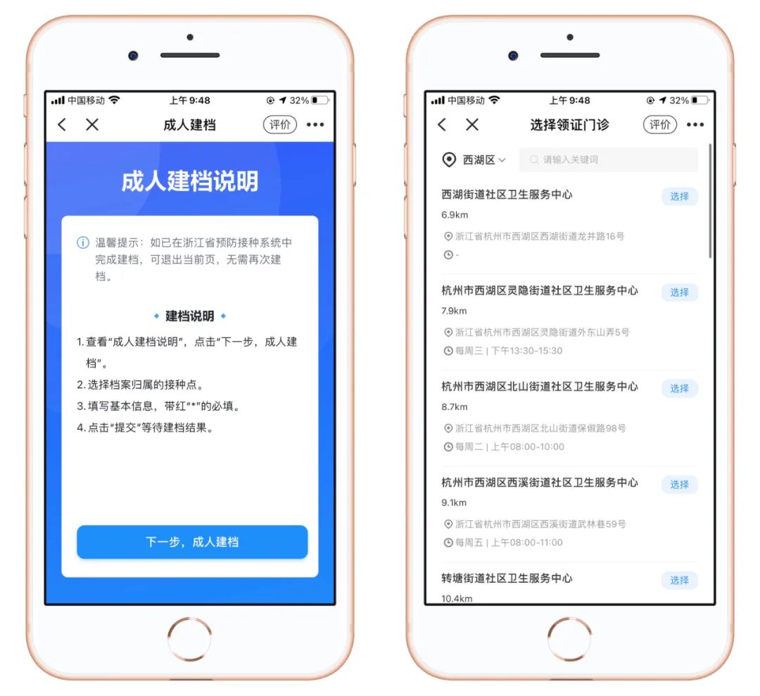 查看建檔說明,選擇領證門診。(可在搜索欄輸入對應接種證申領門診名稱進行關鍵詞搜索)